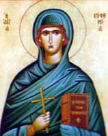 Родом из Халкидона. Отац јој беше Филофрон сенатор, а мајка Теодорисија, обоје благочестиви хришћани. Ефимија беше красна девица и телом и душом. Када Приск антипат устроји празник са жртвоприношењем Ареју у Халкидону, тада се 49 хришћана склонише од тог скверног жртвоприношења и скрише се. Но беху пронађени и изведени пред Приска. Међу њима беше и света Ефимија. Када их охоли Приск упита, зашто се не покоравају заповести царској, они одговорише „и царској и твојој заповести треба се повиновати, ако није супротна небескоме Богу; ако ли је супротна Богу, не само не треба јој се повиновати него јој се треба и противити“. Тада их Приск удараше на разне муке, и то кроз 19 дана, из дана у дан. Двадесетога дана одвоји Ефимију од осталих и поче јој ласкати због лепоте њене, да би је придобио за идолопоклонство. Но како све ласке прођоше узалудно, нареди мучење девице. Мучише је прво на точку, но ангел Божји јави се и изломи точак. По том је бацише у пећ огњену, но Божјом силом би сачувана. Видећ то два војника, Виктор и Состен, повероваше у Христа, због чега бише бачени зверовима; и тако славно скончаше земни живот свој. По том Ефимија би бачена у ров, напуњен водом и сваким отровним гадом; но она прекрсти воду, кад уђе у ров, и оста неповређена. Најзад изведена пред дивље зверове, она се благодарношћу помоли Богу, и предаде дух свој. Родитељи њени чесно сахранише тело њено. Пострада 304. год. и пресели се у вечну радост. Спомиње се и 11. јула.
