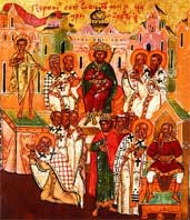 Спомен и похвала Светим Оцима Првог васељенског сабора врши се у недељу пред Духове, или у VII недељу по Васкрсу. Овај Сабор би одржан у Никеји 325. године у време светог цара Константина Великог. Овај Сабор сазван беше да отклони забуну, коју својим кривим учењем створио беше Арије, свештеник александријски. Он је, наиме, распростирао учење, као да је Христос у времену створен од Бога, и да није превечни Син Божји, раван по битности Богу Оцу. На овом Сабору учествовало је триста осамнаест Светих Отаца. Сабор је осудио учење Аријево и Арија предао анатеми, пошто није хтео да се покаје. Још је Сабор коначно утврдио Символ Вере, који је доцније допуњен на Другом васељенском сабору. На Првом васељенском сабору били су многи знаменити светитељи, међу којима су се нарочито истицали: свети Николај Мирликијски, свети Спиридон, свети Атанасије, свети Ахил, свети Пафнутије, свети Јаков Нисивијски, Макарије Јерусалимски, Александар Александријски, Јевстатије Антиохијски, Јевсевије Кесаријски, Митрофан Цариградски, Јован Персијски, Аристак Јерменски и други многи са Истока. Са Запада пак присуствовали су: Осије Кордовски, Теофил Готски, Цецилијан Картагински и други. Главни посао овога Сабора, дакле, био је утврђење Символа Вере. Но, осим тога, Сабор је утврдио и време празновања Васкрса. Решио питање Мелетијевог раскола. И најзад, прописао је двадесет канона.