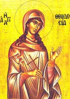 Света мученица Теодосија Тирска. У време цара Максимијана у Кесарији Палестинској стајаху једнога дана многи хришћани везани пред преторијом. Приступи им ова благочестива девица Теодосија и блажаше их и храбраше за смрт мученичку. Војници чувши шта она говори, одведу и њу пред судију. Разјарен судија нареди, те јој обесише камен о врат и бацише је у дубину морску. Но ангели Божји изнесу је живу на обалу. Када се она јави опет судији, овај нареди те је посекоше. Идуће ноћи јави се Теодосија својим родитељима, сва у превеликом небеском сјају, окружена многим другим спасеним девојкама, и рече: „Видите ли, колика је слава и благодат Христа мога, које сте ме хтели лишити?“ А то рече родитељима зато што је они одвраћаху од исповедања Христа и мучеништва. Чесно пострада и прослави се 308. године.