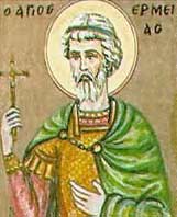 Свети апостол Јерма би један од Седамдесеторице. Споменут у посланици апостола Павла к Римљанима (Рм 16, 14). Родом је био Грк, но живео је дуго у Риму. Био је епископ у Филипопољу, и завршио је свој живот мученички. Саставио је врло поучну књигу Пастир према откровењима ангела Божјег. Јерма је био богат човек, но због греха својих и својих синова падне у крајњу сиромаштину. Једном на молитви јави му се човек у белој одећи и са штапом у руци, и рече му да је он ангел покајања, који је њему послат до краја живота његовог (Јерминог). И даде му ангел дванаест заповести: 1. веровати у Бога; 2. живети у простоти и невиности, не злостављати и давати милостињу сваком ко проси; 3. љубити истину и избегавати лаж; 4. чувати целомудреност у помислима; 5. учити се трпљењу и великодушности; 6. знати да уза сваког човека пристављен је по један добар и по један зао дух; 7. бојати се Бога и не бојати се ђавола; 8. чинити свако добро и уздржавати се од сваког зла дела; 9. молити се Богу из дубине душе с вером да ће се молитва наша услишити; 10. чувати се од туге, као сестре сумње и гнева; 11. испитивати истинита и лажна пророчанства; 12. чувати се од сваке зле жеље.