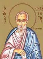 Из села Амније у Пафлагонији. У почетку би Филарет човек врло имућан, но делећи много милостињу сиромасима, обништа веома. Али, он се не устраши сиромаштине, него с надом у Бога, који је рекао: „Блажени милостиви, јер ће бити помиловани,“ (Мт 5, 7) продужи дела милосрђа не обзирући се на негодовања жене своје и деце. Док је једном орао, дође му човек и пожали се, да му је цркао во у јарму, те не може с једним волом да оре. Он испреже једног свог вола и даде му. Даде и последњег свог коња некоме, ко би позват да иде с коњем у рат. Даде и теле од последње краве, па кад опази да крава риче за раздвојеним телетом, а теле за кравом, довика човека, па му уз теле даде и краву. И оста престарели Филарет без хране у празној кући. Но он се Богу мољаше и у Бога уздаше. И Бог не остави праведника, да буде посрамљен у нади својој. У то време цароваше Ирина са младим сином Константином. По тадашњем обичају посла царица људе, да траже по целом царству најбољу и најугледнију девојку, којом би оженила сина цара. Промислом Божјим ти људи падоше на конак у кућу Филаретову, видеше његову унуку Марију, ћерку његове ћерке Ипатије, прекрасну и кротку унуку Марију, и одведоше је у Цариград. Цару се допадне девојка и он се венча с њом, а Филарета и сву његову породицу пресели у престоницу и даде му велику част и богатство. Но, Филарет се не погорди таквом изненадном срећом, него, благодаран Богу, продужи сада чинити добра дела још више него пре. И чињаше их тако до саме смрти. У деведесетој години својој призва децу своју, благослови их и поучи, да се држе Бога и закона Божјег, и прозорљивим духом, као негда праотац Јаков, прорече им свакоме, како ће овај век проживети. Потом леже у манастиру Родолфији и предаде душу своју Богу. Пред смрт му лице засија као сунце, а по смрти од њега изађе необичан благоухани мирис, и бише чудеса од моштију његових. Упокоји се овај праведник Божји 797. године. Његова супруга Теозва као и сва његова деца и унучад поживеше богоугодно и скончаше у Господу.