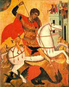 Овај славни и победоносни светитељ беше рођен у Кападокији као син богатих и благочестивих родитеља. Отац му пострада за Христа, и мајка му се пресели у Палестину. Када порасте Ђорђе оде у војску, где доспе у двадесетој својој години до чина трибуна, и као такав беше на служби при цару Диоклецијану. Када овај цар отпоче страшно гоњење на хришћане, ступи Ђорђе пред њега и одважно исповеди, да је и он хришћанин. Цар га баци у тамницу, а нареди да му се ноге ставе у кладе а на прси тежак камен. По том нареди, те га везаше на точак, под којим беху даске са великим ексерима, и да га тако окрећу, док му цело тело не поста као једна крвава рана. По том га закопа у ров, тако да му само глава беше ван земље, и остави га у рову три дана и три ноћи. По том преко некога мађионичара даде му смртоносни отров. Но при свим овим мукама Ђорђе се непрестано мољаше Богу, и Бог га исцељиваше тренутно, и спасаваше од смрти на велико удивљење народа. Када и мртваца једног молитвом васкрсе, тада многи примише веру Христову. Међу овима беше и жена царева Александра, и главни жрец Атанасије, и земљоделац Гликерије, и Валерије, Донат и Терина. Најзад осуди цар Ђорђа и своју жену Александру на посечење мачем. Блажена Александра издахну на губилишту пре посечења, а св. Ђорђе би посечен 303 год. Чудесима, која се десише на гробу св. Ђорђа нема броја. Нема броја ни његовим јављањима у сну и на јави многима, који га споменуше и његову помоћ поискаше од онда до дана данашњега. Разгоревши се љубављу према Христу Господу светом Ђорђу не беше тешко све оставити ради те љубави: и чин, и богатство, и царску почаст, и пријатеље, и сав свет. За ту љубав Господ га награди венцем неувеле славе на небу и на земљи и животом вечним у царству Свом. Још му дарова Господ силу и власт да помаже у бедама и невољама свима онима који га славе и његово име призивају.