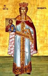 Грчка царица, супруга злога цара Теофила иконоборца. По смрти Теофиловој Теодора се зацари са својим сином Михаилом III. Одмах успостави поштовање икона на сабору у Цариграду 842. године. Том приликом установљено је празновање победе Православља, које се до дана данашњега врши у прву недељу Часнога поста. Ова света, за Цркву заслужна жена, предаде душу своју Богу 11. фебруара 867. године. У то време потпуног торжества Православља над свима јересима буду, по Божјем дивном Промислу, послати свети Кирил и Методије међу Словене као мисионари хришћански. Беше порек лом из Пафлогонијске области, ћерка знатног оца по имену Марина и благочестиве мајке Теоктисте, ревносне иконопоштоватељке. Блажена Теодора од детињства беше врло лепа, мудра и веома побожна, усрдна поштоватељка светих икона. Због њене лепоте цар Теофило је узе себи за жену. Поштовање пак светих Икона ова блажена није напустила ни као супруга злог иконоборца Теофила, него је, и поред цареве строге забране, држала скривене тајно на двору свете Иконе и, са својом мајком Теоктистом и својих пет кћери које доби са Теофилом, тајно им се клањала, и целивала их. Ноћу је устајала да се моли пред Часним Крстом и светим Иконама Христа Спаса и Богоматере, које је преко дана скривала у својим одајама по ћивотима, еда би тако умолила Бога да се смилује на православне. Због свога поштовања светих Икона блажена царица долажаше више пута у опасност пред царем, али је Бог увек избављаше. Тако једном, док се она молила тајно у својим одајама и целивала свете Иконе, упаде у њену собу неки човек кепец, дворска будала цара Теофила, и видећи је да се клања светим Иконама отиде и одбрбља цару шта је видео. Разбеснели цар упаде у њену собу, али га ова блажена прибрано срете и умири га тврдећи да је само стајала пред својим огледалом када је овај кепец ушао у њену собу. Другом једном приликом блажена царица отиде са својих 5 ћерки, које су се звале: Марија, Текла, Ана, Анастасија и Пулхерија, код своје мајке Теоктисте у посету. Благочестива баба одмах извади скривене мале иконице и стави их на главу и уста својих унука да им се поклоне и да их целивају. Она им говораше да су то лепе играчкице, а старијим девојчицама још запрети да о томе шта су виделе ништа не говоре своме оцу. Када се девојчице вратише натраг и цар отац их запита шта им је дала баба, старије ћутаху, док најмлађа Пулхерија, још муцајући јер беше мала, рече да им је баба показивала играчке. Цар отада забрани деци да више не иду код своје бабе. Иконоборни цар Теофило, као и његови претходници, цареви иконоборци, довео је био за патријарха човека јеретика, ватреног иконоборца Јована Граматика (837-842), који је заједно са царем почео прогоне православних иконопоштоватеља, особито монаха. Ускоро међутим овај цар јеретик умре, 28. фебруара 842 год., и царство пређе у руке његовог малолетног сина и наследника Михаила III и мајке му блажене царице Теодоре, која сина свог беше тајно научила Православљу. Мајка и син одмах пожуре да васпоставе благочестиво поштовање светих Икона. Видећи то јеретички патријарх Јован покуша да се представи као жртва неке завере, а уствари би оптужен за покушај самоубиства и одмах саборно би збачен и осуђен. На његово место Сабор, који блажена царица сазва од повраћених из тамнице и изгнанства православних исповедника, пастира и монаха, изабра ј