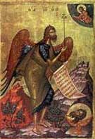 Памјат праведнаго с похвалами, тебје же довљет свидјетељство Господње, Претече, показал бо сја јеси воистину и пророков честњејшиј, јако и струјах крестити сподобилсја јеси проповједанаго, тјемже за истину пострадав радујасја благовјестил јеси и сушчим во адје Бога јавлшагосја плотију, в земљушчаго грјех мира, и подајушчаго нам велију милост.